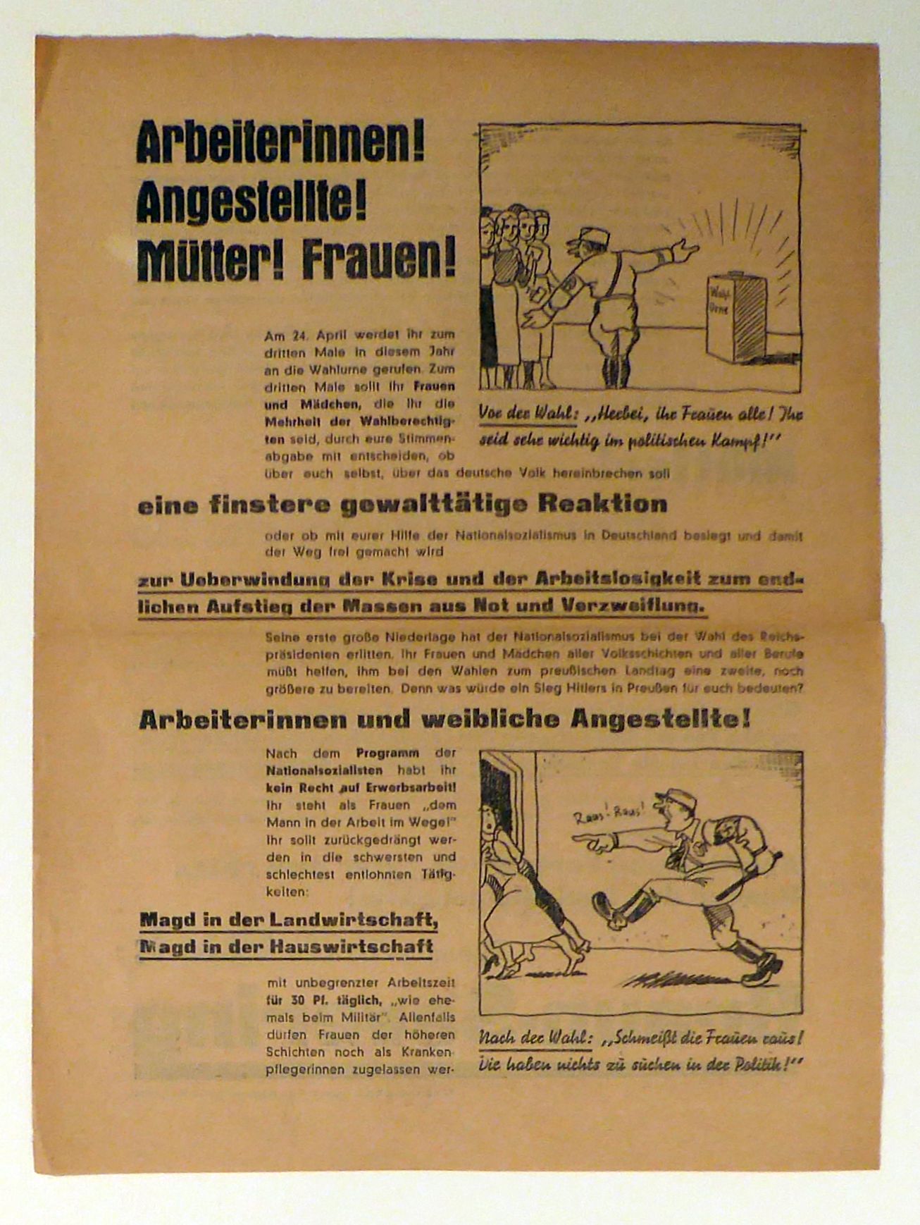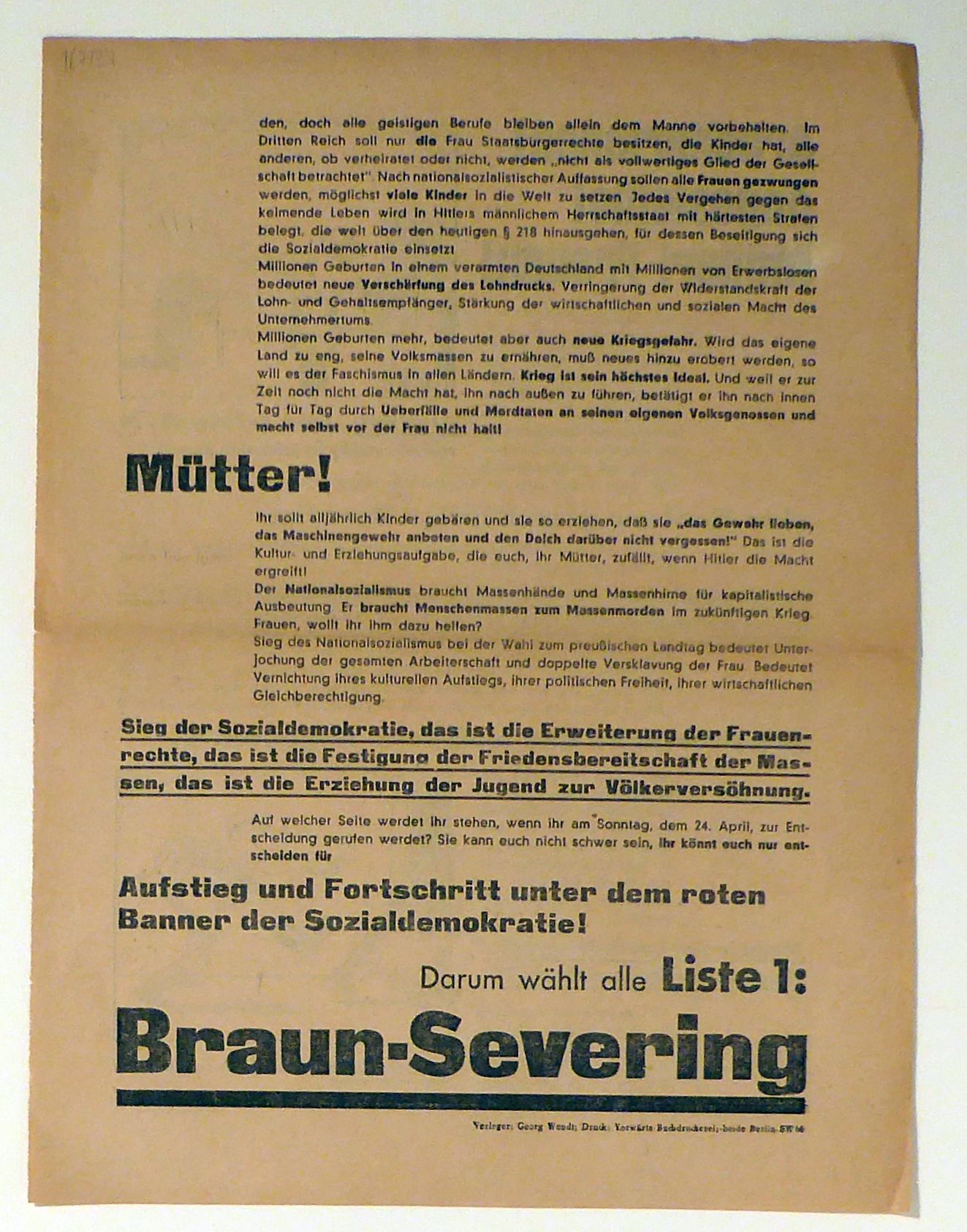 Bln.: Georg Wendt, 1932. 1 Bl., Einband: Einblatt. Format: 2°. An die Frauen gerichtetes doppelseitig bedrucktes Flugblatt der Sozialdemokratie für die Liste 1 anlässlich der Wahl vom 24. April 1932 des Preussischen Landtags, gedruckt in Fraktur