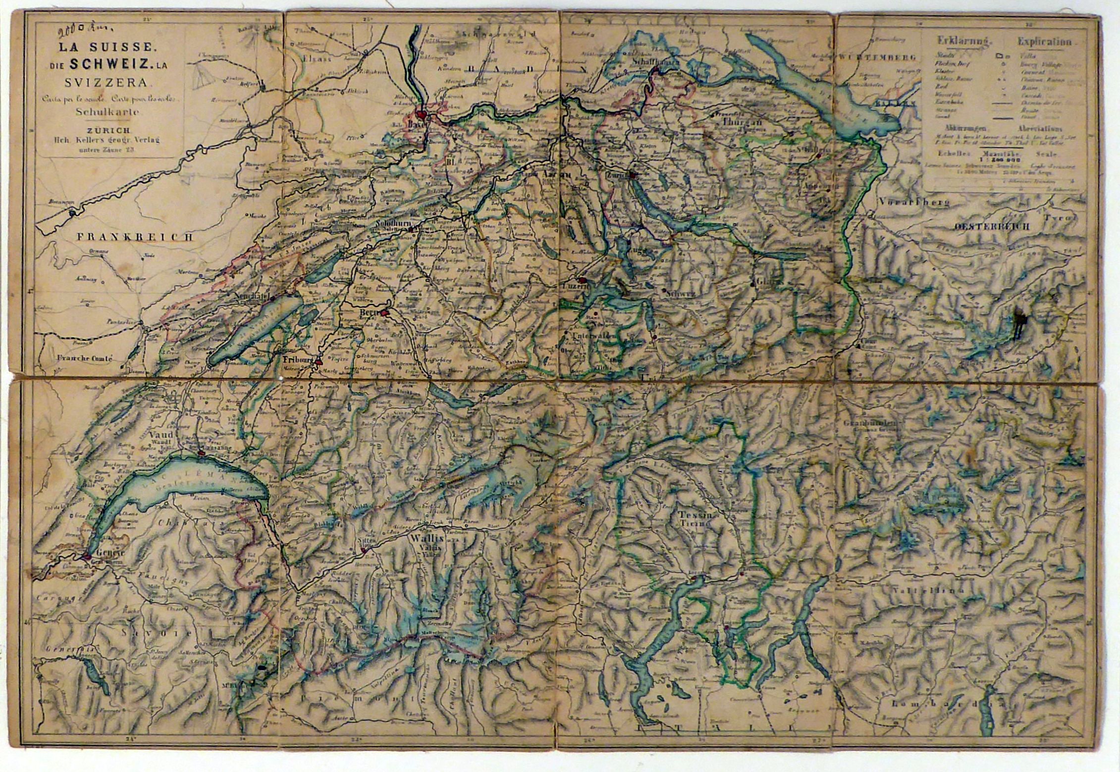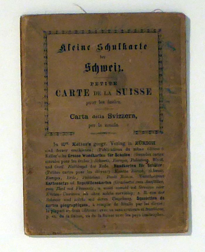Petite Carte de la Suisse pour les écoles. Carta della Svizzera per le scuole Maasstäbe 1:800 000. Zürich: Hri Keller, um 1870. 1 Bll., mehrfach gefaltet, Einband: auf Leinwand aufgezogen. Format: 45x30 cm (bxh); gefaltet 11x15cm. Graf 560. Zweisprachige (Deutsch und Französisch) mehrfarbige lithographierte Karte mit einem Masstab in Schweizer Stunden (1 = 4800 Meter). Auf dem umseitigen Titelblatt ein Verlagsverzeichnis