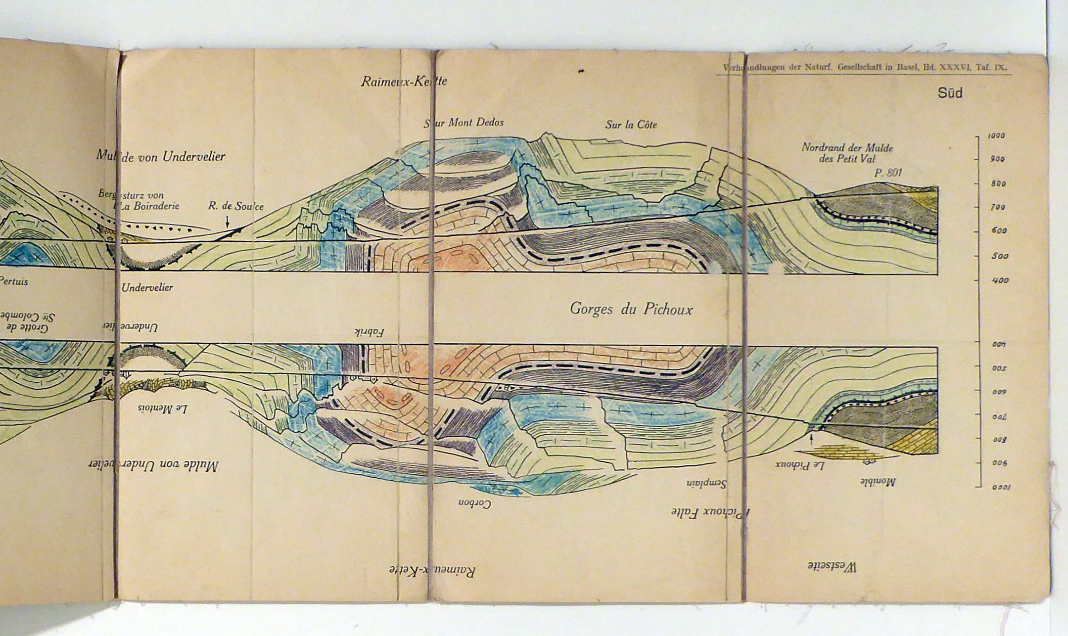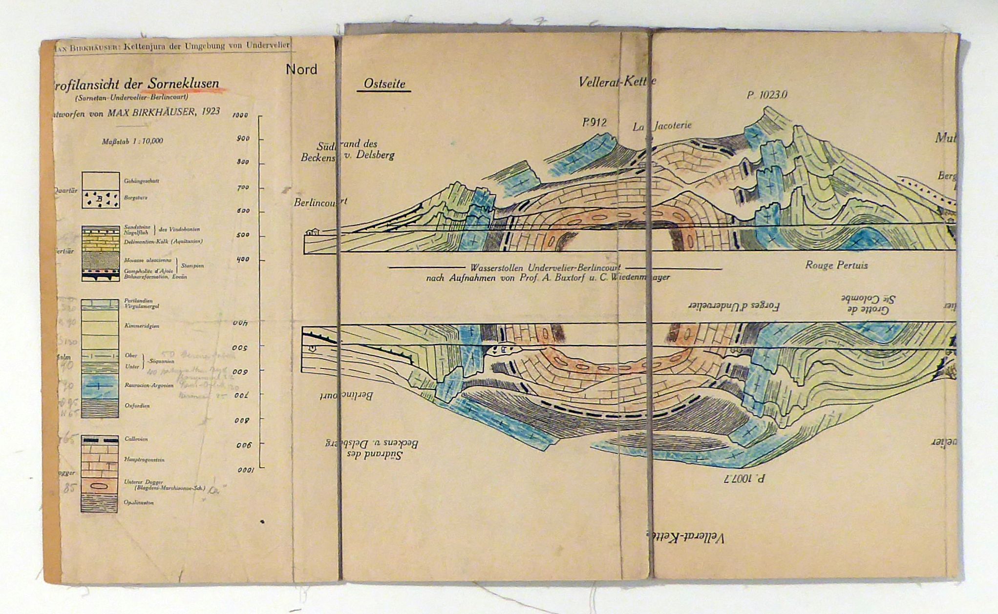 (Sornetan - Undervelier - Berlincourt) Entworfen von Max Birkhäuser. Masstab 1:10000. Basel: Birkhäuser, [1920]. 1 Bltt, mehrfarbiges Profil. Einband: ungebunden, auf Leinwand aufgezogen. Format: 56 x 21 cm (bxh), 6teilig. Reihe: Separatdruck aus den Verhandlungen der Naturforschenden Gesellschaft in Basel, Band XXXVI, Tafel IX.