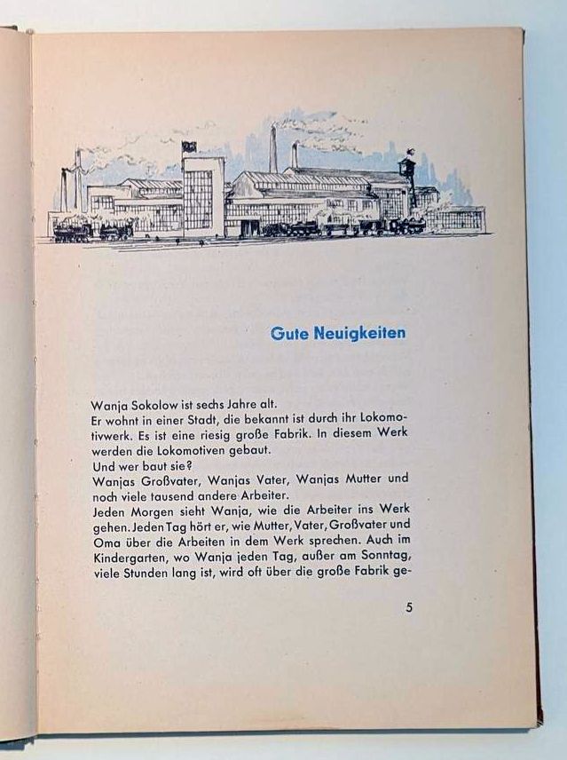 Berlin: Der Kinderbuchverlag, 1952. 106, [6] S., mit doppelseitiger Illustration auf dem Innendeckel und dem fliegenden Vorsatz und zweifarbigen Illustrationen im Text nach Zeichnungen von Fritz Bley. Einband: Original-Halbleinwand. Format: gr.8°. Aus dem Russischen übersetzt von Josi von Koskull. Ausgehend von sechsjährigen Wanja Sokolow erzählt Evgenij Schwarz über den Alltag einer vorbildlichen Arbeiterfamilie, über die Bedeutung des Lokwerks für die Stadt und das Land, über die Funktion der Eisenbahn für den Handel, aber auch über den Fortschritt gegenüber früheren Verhältnissen im Lande