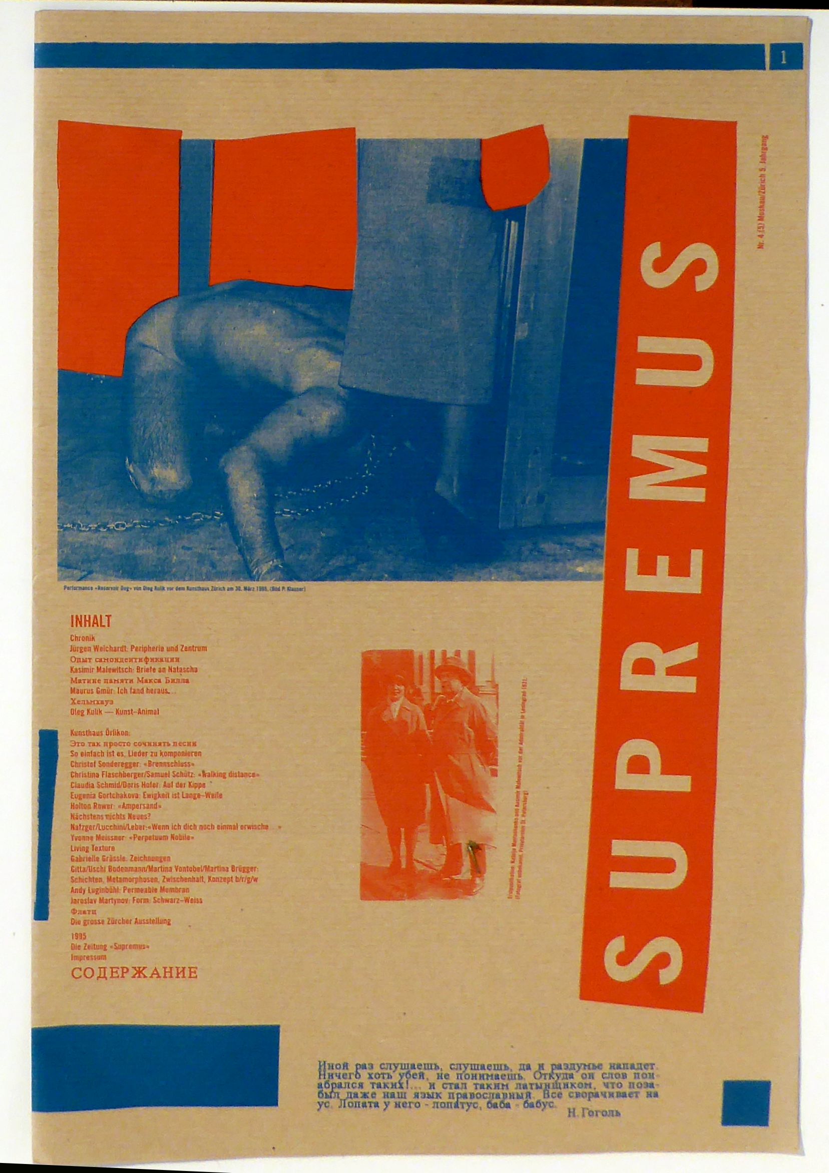Nr. 1 der Zeitschrift Supremus (1991-2001, beginnend mit Nummer 0). "Jede Nummer konzentriert sich auf ein bestimmtes Thema, wird von einem Künstler individuell gestaltet und unterscheidet sich in Farbe und Papier. Konstant bleiben stets das Format und der Umfang (16 Seiten) sowie der Zweifarbendruck. Als inhaltliche Grundlagen dienen hauptsächlich Publikationen, die in Verbindung mit Malewitsch und seinen Schülern stehen, Dokumente und Manifeste von Künstlern der Vergangenheit und der Gegenwart, schwer zugängliche Artikel aus Archiven der regionalen Presse, Chroniken laufender Ereignisse, Katalogangaben, Themen der Volkskunst, prähistorische und klassische Kunst." (Aus der Nummer 4/5)
