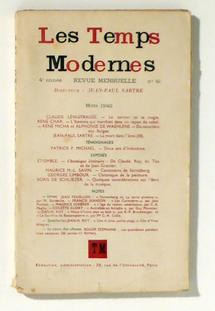 Revue Mensuelle. Directeur Jean Paul Sartre. Paris: Les Temps Modernes, 1949. [387]-576 p., Einband: französische Broschur. Format: 8°. Reihe: 4e année, Mars 1949, n° 41.