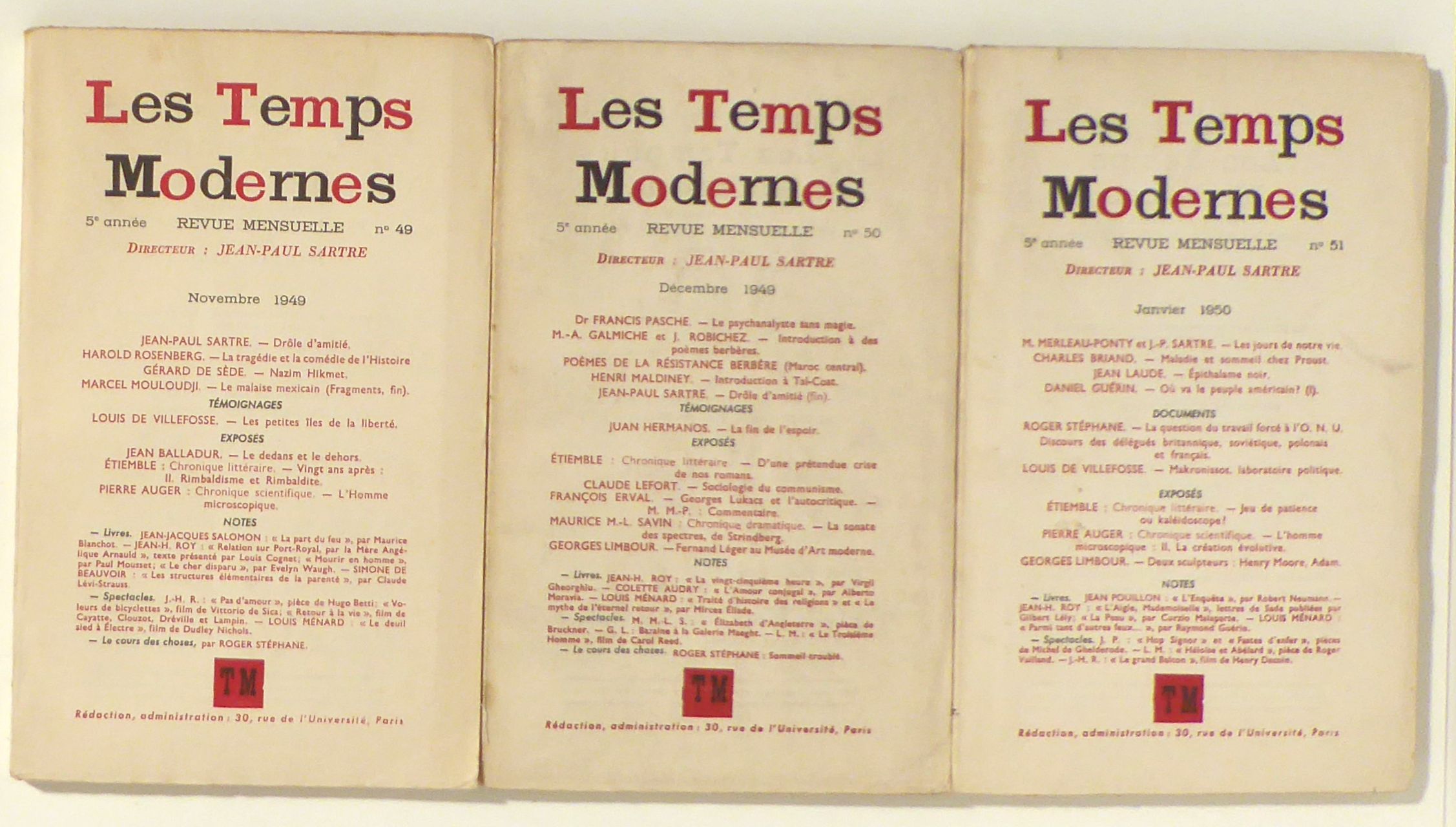 Revue Mensuelle. Directeur Jean Paul Sartre. Paris: Les Temps Modernes, 1949. [769]-1344 p., Einband: französische Broschur. Format: 8°. Reihe: 5e année, Novembre 1949, n° 49, Décembre 1949, no 50, Janvier 1950 n° 51.