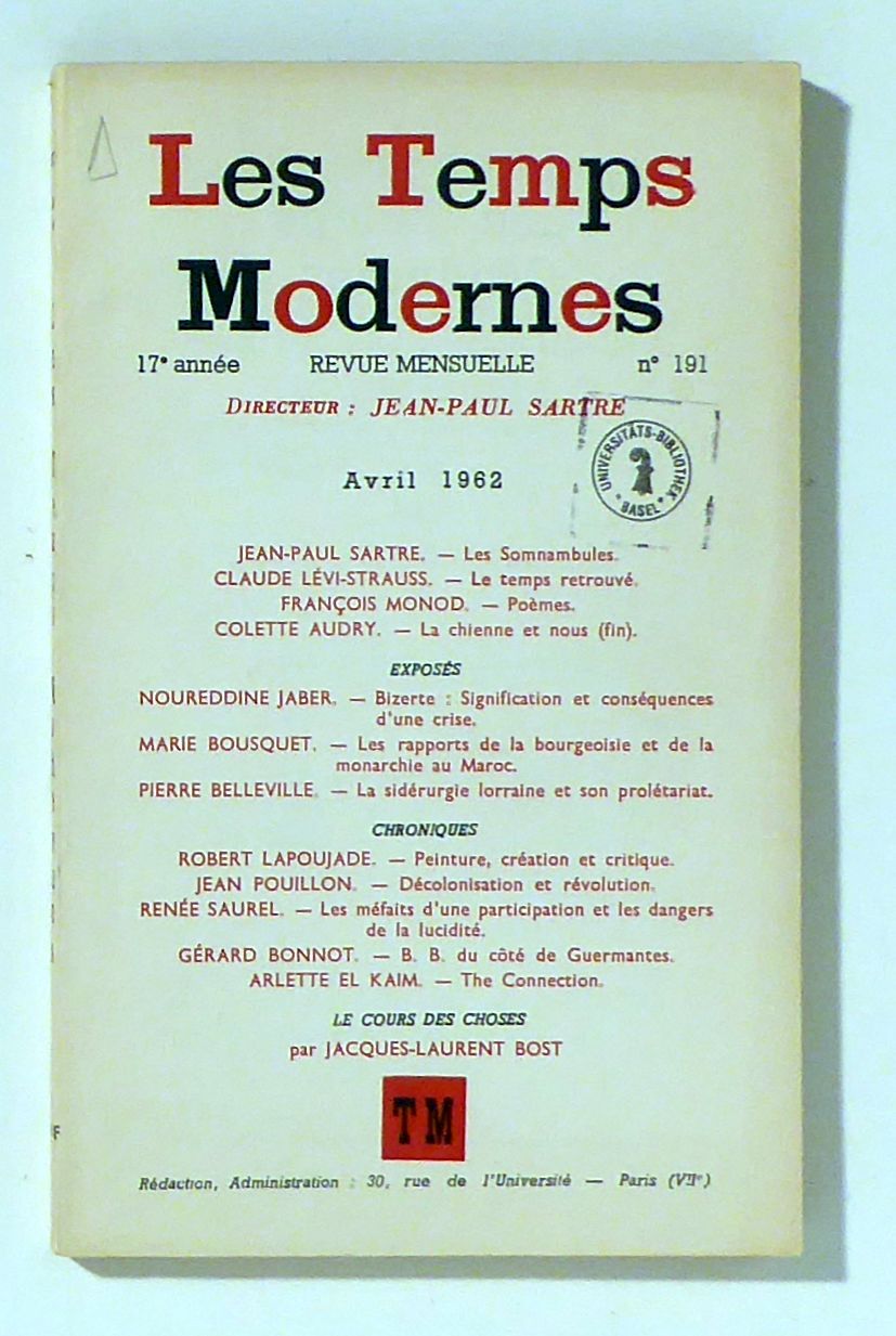 Revue Mensuelle. Directeur Jean Paul Sartre. Paris: Les Temps Modernes, 1962. [1397]-1588 p., Einband: Original-Broschur. Format: 8°. Reihe: 17e année, Avril 1962, n° 191.