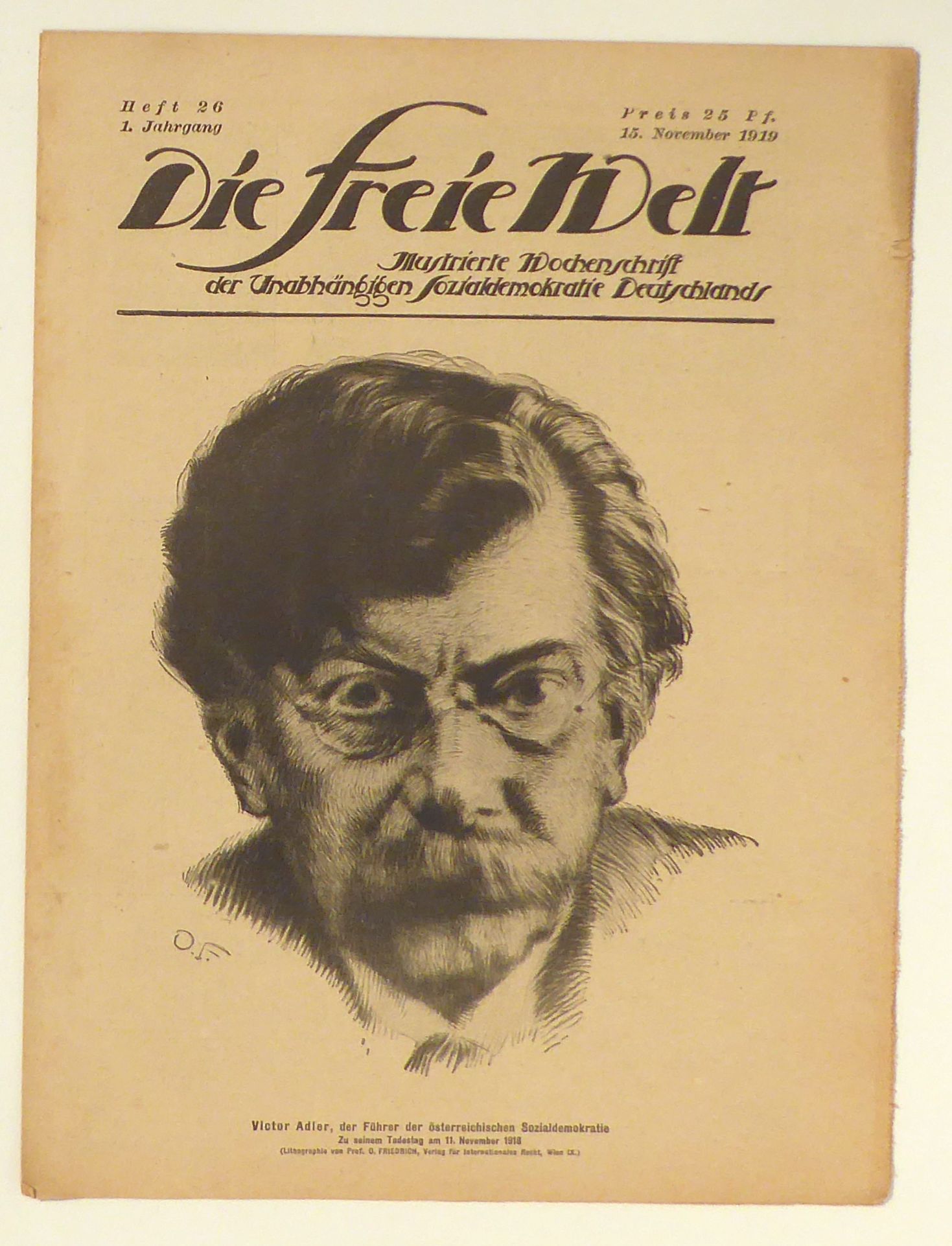 Illustrierte Wochenschrift der Unabhängigen Sozialdemokratie Deutschlands. Berlin: Verlagsgemnossenschaft "Freiheit", 1919. 8 S., mit Abbildungen nach Fotografien sowie nach einer Lithographie vpon Otto Friedrich und einer Karikatur von Karl Holtz. Einband: lose Bogen. Format: gr.4°. Reihe: Heft 26, 1. Jahrgang, 15. November 1919.