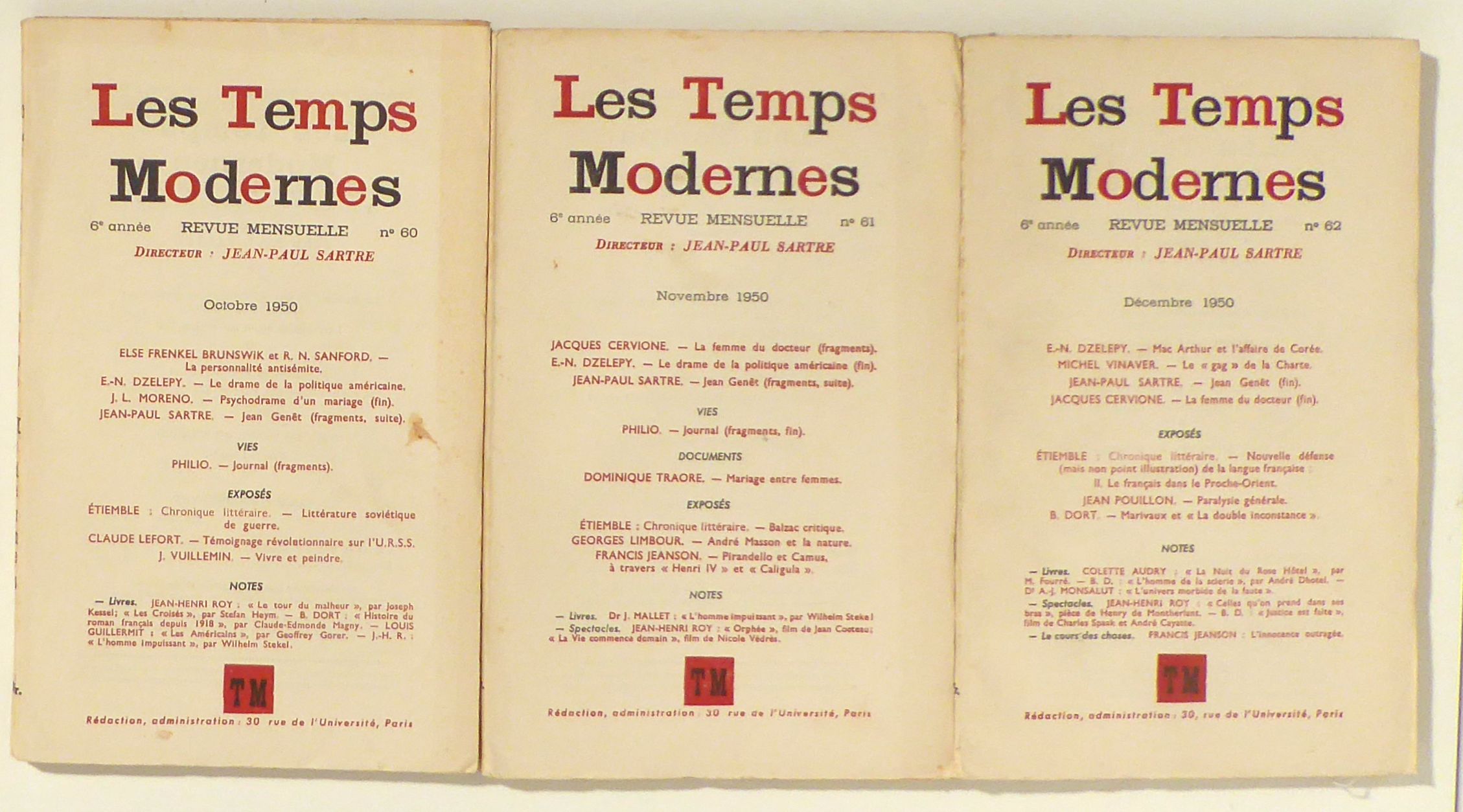 Revue mensuelle: Directeur Jean-Paul Sartre. Paris: Temps Modernes, 1950. 3, p. [577]-[1152], Einband: Original-Broschur. Format: 8°. Reihe: Les Temps Modernes, 6e année, N° 60-62, Octobre décembre1950.