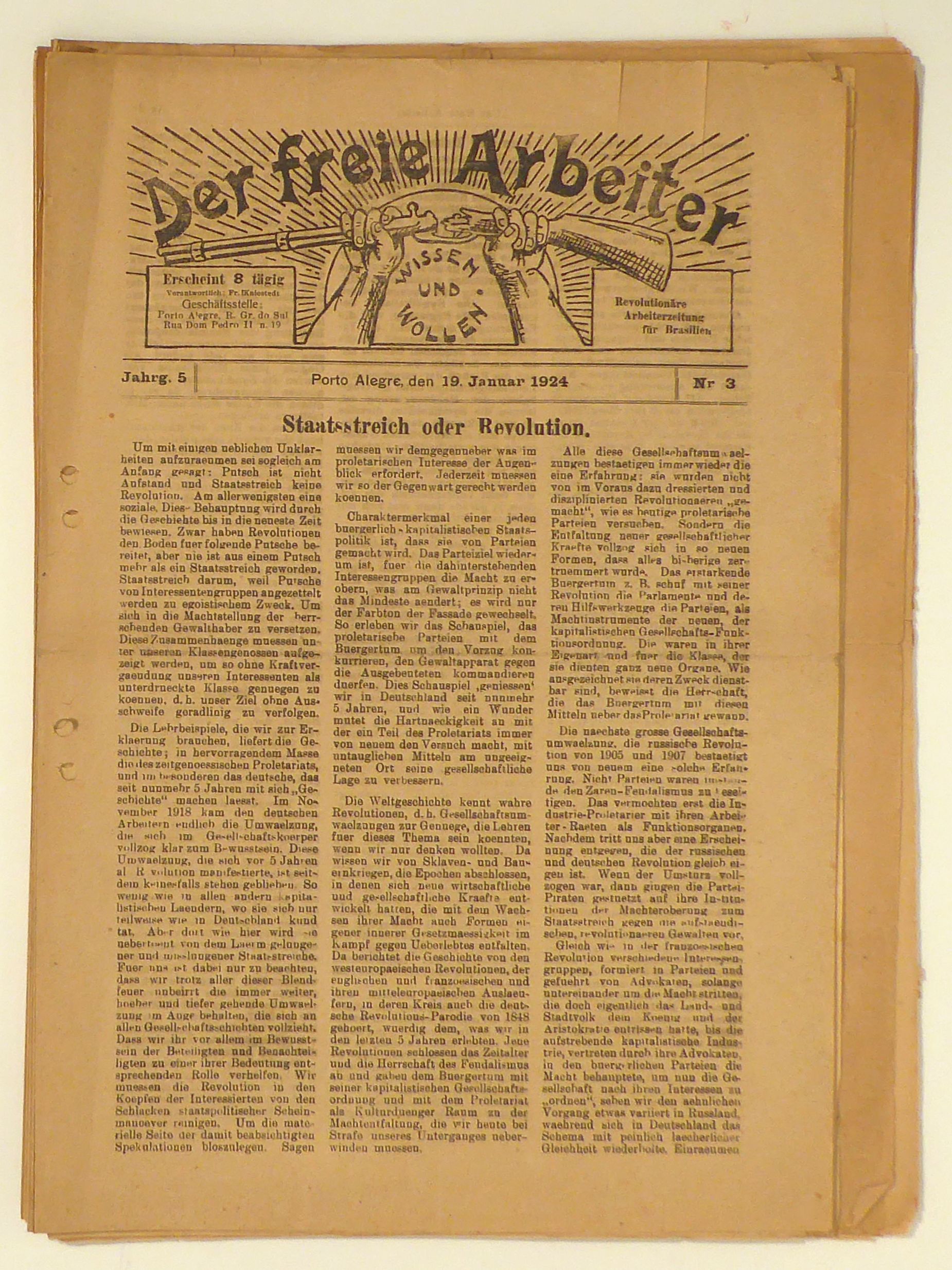 Wissen und Wollen. Revolutionäre Arbeiterzeitung für Brasilien. Porto Allegre (Brasilien): Sozialistischer Arbeiter-Verein, 1924. 17 Doppelbogen, Einband: lose Bogen. Format: fr.4°. Reihe: Der Freie Arbeiter, Jahrgang 5, 1924.