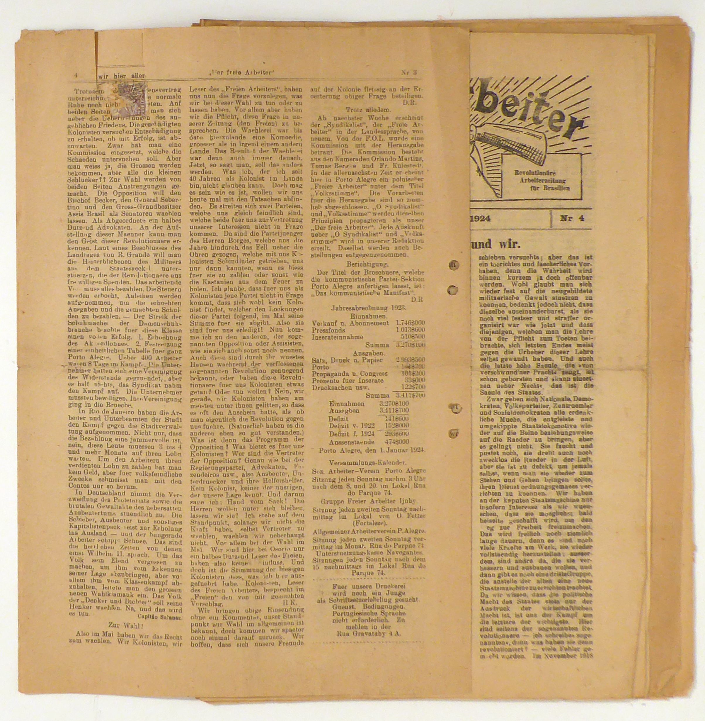 Seywald Nr. 280. Die Nummern 3, 4, 7, 8, 9, 10, 21/22, 25/26, 27/28, 29/30, 31/32, 33/34, 35/36, 37/38, 39/40, 45/49, 47/48, erschienen zwischen dem 19. Januar und 20. Dezember 1924. Herausgeber der anarchistischen Wochenzeitung war der Deutsche Friedrich Kniestedt, in Köthen/Anhalt geboren und 1913 nach Brasilien ausgewandert. Er starb 1947 in Porto Allegre. Die Zeitung befasste sich auch mit brasilianischer Politik, im Zentrum standen aber die Organisationen deutscher Einwanderer und ihre politischen und kulturellen Aktiviutäten in Brasilien, der Anarchismus und das Geschehen in Deutschland sowie der übrigen Welt. Der freie Arbeiter erschien von 1920 bis 1930. In den 1930er Jahren war er Mitbegründer der "Liga für Menschenrechte" und gab für die die Zeitschriften „Aktion“, „Zirkular“, „Alarm“ und „Das deutsche Buch“ heraus. Am Tag der Machtübernahme Hitlers, am 30. Januar 1933, organisierte Kniestedt die wohl erste antifaschistische Kundgebung in Brasilien. Selten