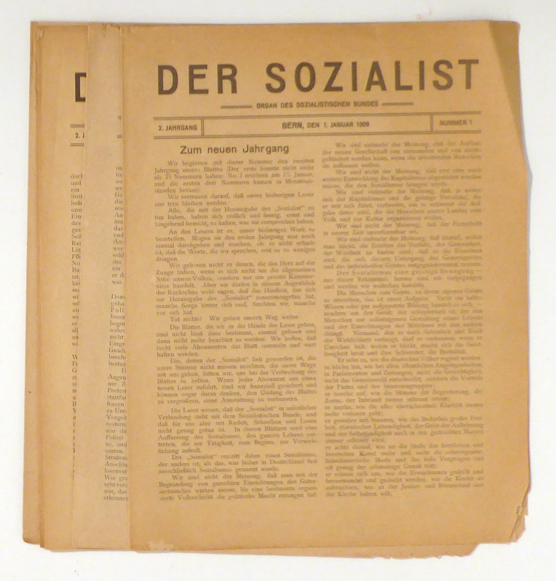 Organ des Sozialistischen Bundes. Bern: Sozialistischer Bund, 1909. 5 Hefte, S. 1-32, 41-48, Einband: Original-Broschur, nicht gebundener Doppelbogen. Format: 4°. Reihe: Der Sozialist, 2. Jahrgang, Nr. 1-4, 6.
