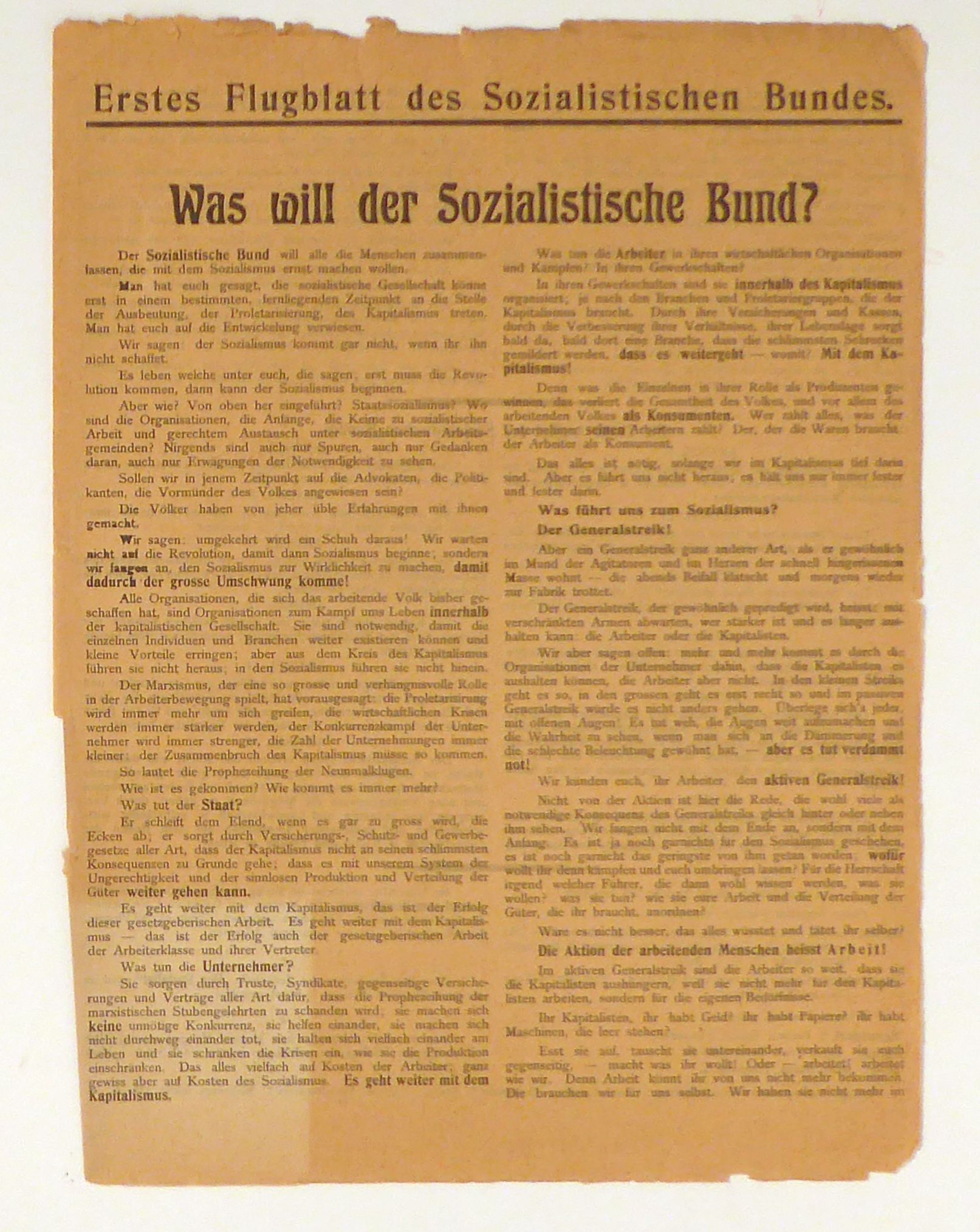 Was will der Sozialistische Bund. Berlin: Gustav Landauer, Buchdruckerei C. Kielmeyer, [1908]. 1 Bl., Einband: Einblatt. Format: 23x32 cm (bxh). Anschliessend an die Ziele die zwölf Artikel des Sozialistischen Bundes Angaben über die Organisationsform in Gruppen. Bei der Gründung gab es Gruppen in Berlin (Gruppenwart B. Burchardt), Oranienburg (Karl Tomys), Hermsdorf (Gustav Landauer), Zürich (Ernst Frick) und Bern (Mark Harda). Der Sozialistische Bund wurde 1908 gründet, zu den Gründern gehörten Gustav Landauer, Erich Mühsam, Martin Buber und Margarethe Faas-Hardegger