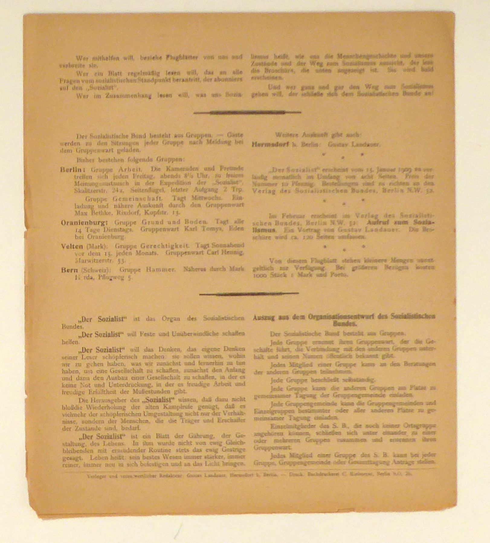Wasist zunächst zu tun?. Berlin: Gustav Landauer, Buchdruckerei C. Kielmeyer, [1908]. 4 S., Einband: lose Bogen. Format: 23x27 cm (bxh). Anschliessend an die geplanten Aktivitäten werden Angaben über die Organisationsform in Gruppen. Bei der Gründung gab es Gruppen in Berlin (Gruppenwart B. Burchardt), Oranienburg (Karl Tomys), Hermsdorf (Gustav Landauer), Zürich (Ernst Frick) und Bern (Mark Harda), im zweiten Flugblatt, das entweder 1908 0der 1909 erschien, ist Velten mit Carl Hennig als Verantwortlichem dazugekommen. Der Sozialistische Bund wurde 1908 gründet, zu den Gründern gehörten Gustav Landauer, Erich Mühsam, Martin Buber und Margarethe Faas-Hardegger