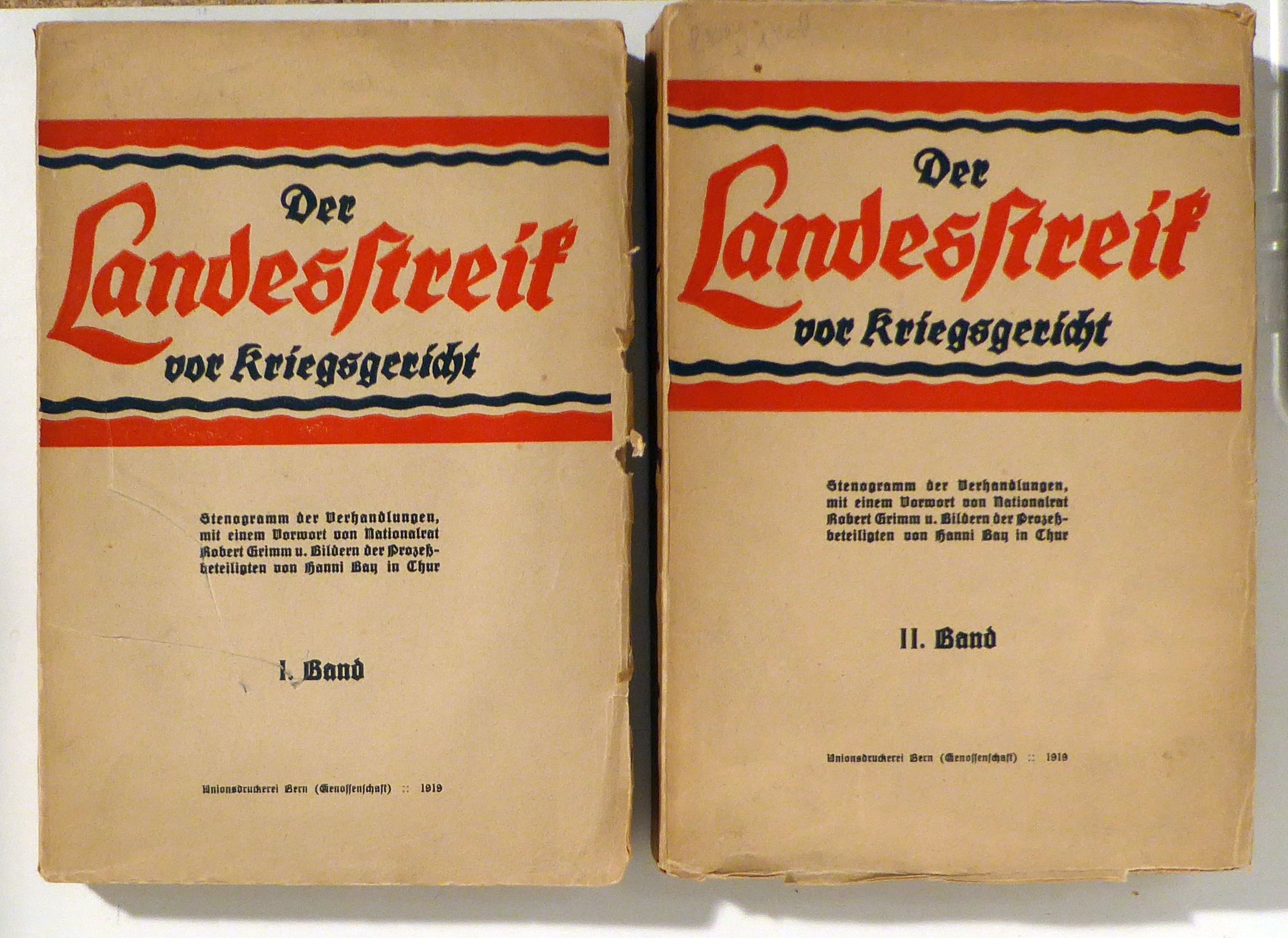 Mit einem Vorwort von Robert Grimm und Bildnissen der Angeklagten, Verteidiger und Richter, gezeichnet von Hanni Bay. Beiheft: Der Generalstreikprozess in Karikatur. 39 farbige Lithographien von Luzifer (Rolf Roth), 2. Auflage. Bern; Olten: Unionsdruckerei; Trösch, 1919. 2 Bde.1 Beiheft, XV, 1221 S. (durchgehend paginiert), [2] 40 S., Einband: Or.br. nicht aufgeschnitten. Format: gr.8°.