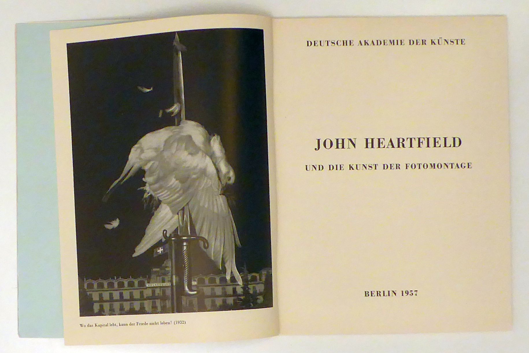 Hrsg. zu der vom 30. August bis 25. September 1957 veranstalteten Ausstellung. Redaktion und Gestaltung von Gerhard Pommeranz-Liedtke. Bln.: Deutsche Akademie der Künste, 1957. 62 S., mit Porträt und 43 s/w Abbildungen nach Fotomontagen von John Heartfield. Einband: Original-Broschur mit Schutzumschlag. Format: 8°. Mit einem Vorwort von Bertolt Brecht und einem Beitrag von Bodo Uhse (John Heartfield und seine Fotomontagen)