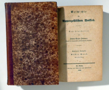 Neu bearbeitet. Wohlfeile Ausgabe. St. Gallen: Scheitlin und Zollikofer, 1842. 3 Bde. geb. in 4 Bände; XIV, 570, [18]; 471, [8]; 462, [9]; 473, [4] S., mit einer mehrfach gefalteten gestochenen Karte, aufgenommen von J[ohann] L[udwig] Merz, Herisau. Einband: Hldr. d.Zt., mit marmorierten Überzugspapieren. Format: 8°. Feller/Bonjour 710. Im ersten Band eine mehrfach gefaltete "Charte der Vogteien und Pfarreien in welche im XIVten Jahrhundert der jetzige Kanton Appenzell eingetheilt war", aufgenommen von Johann Ludwig Merz. Schmucker Halblederband der Zeit mit marmorierten Überzugspapieren und dazu passendem dreiseitig marmoriertem Schnitt, gedruckt in Fraktur