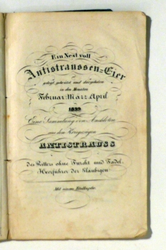 Eine Sammlung von Anekdoten aus den Kriegszügen Antistrauss, des Ritters ohne Furcht und Tadel, Heerführer der Gläubigen . Mit einem Titelkupfer. o.O.: o.N., 1840. 48 S., Gestochenes Frontispiz, gestochener Titel. Einband: Interimsbroschur. Format: 8°. Erstausgabe. Sammlung von Anektoten, Versen und Zitaten aus dem Kampf der religiös motivierten Gegner einer Berufung von David Friedrich Strauss an die Universität von Zürich. Der Autor des damals heftig bekämpften Buches "Das Leben Jesu" war deswegen in Deutschland als Professor entlassen worden und erhielt daraufhin einen Ruf nach Zürich. Aber auch hier war der Widerstand gegen den Junghegelianer gross - so gross, dass ihn die Zürcher noch vor Amtsantritt in den Ruhestand versetzten. Das Frontispiz zeigt geistliche und weltliche Würdenträger - alle Schriften oder Zeitungen von D.B. (meint wohl David Bürkli, den Herausgeber der "Freitags-Zeitung"), E.K. oder Sh lesend oder mit sich tragend - beim Legen und Ausbrüten von Anti-Strausseneiern und Befeuern eines Schwitzbades, in dem wohl den Strauss-Anhängern eingeheizt werden soll