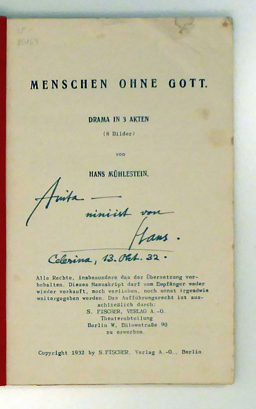 Drama in drei Akten. Bln.: S. Fischer, 1932. 100 einseitig bedruckte Seiten, mit einer Fotocollage auf dem Schutzumschlag. Einband: Original kartoniert. Format: 8°. Erstausgabe. Kritische Auseinandersetzung mit Stalin. Typoskript. Mit einer eigenhändigen, datierten Widmung an seine Frau Anita [Mühlestein]