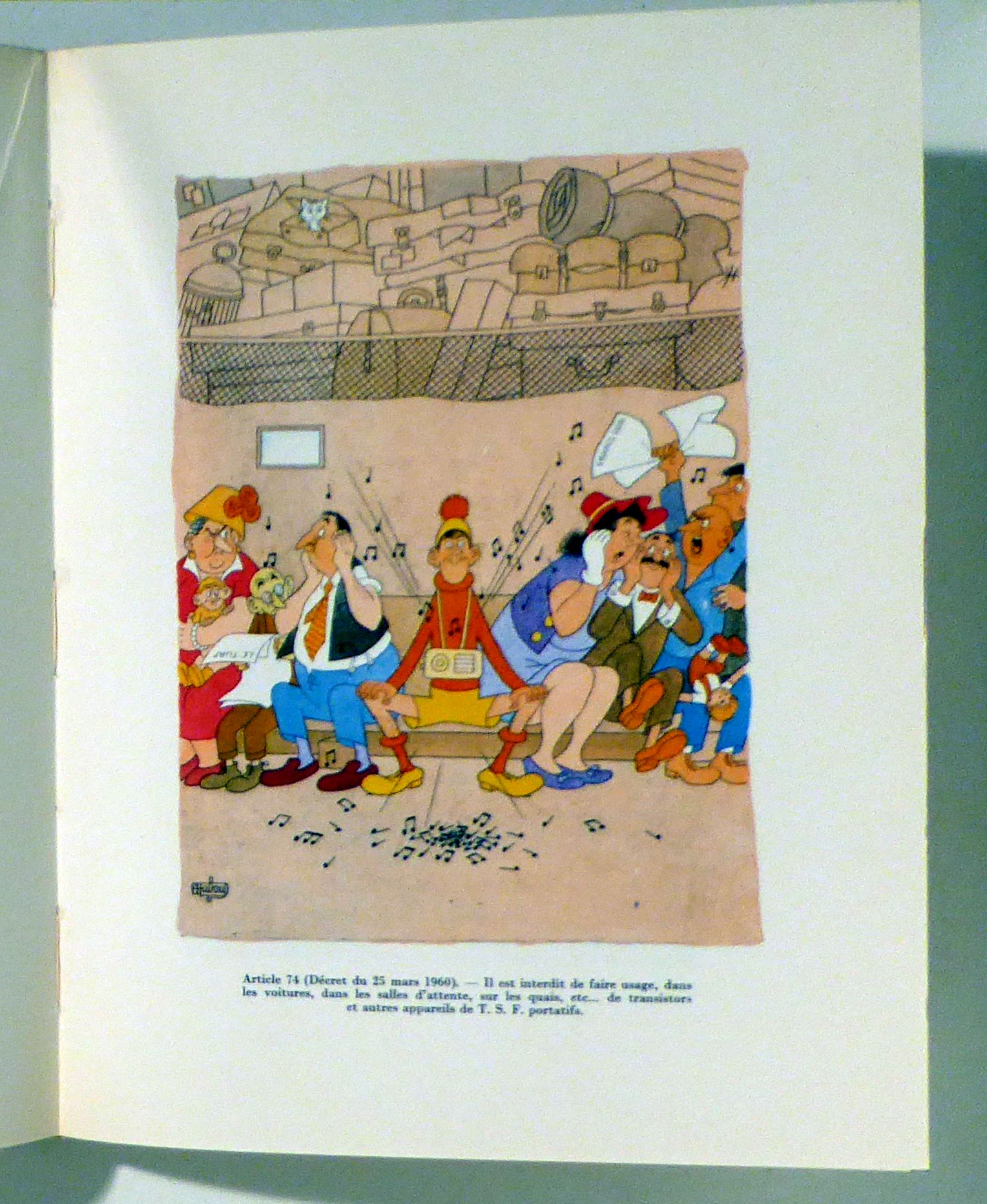 Textes législatifs officiels. Avions - Bateaux - Chemins de fer - Douanes - Hôtels deTourisme - Chasse - Pêche - Camping - Jeux dans les Casinos. Illustrations de Dubout. Paris: Maurice Gonon, 1960. [4], 239 [4] S., mit farbig illustrierten Vorsatzpapieren und zahlreichen, meist ganzseitigen farbigen Illustrationen von Dubout. Einband: Farbig illustr. Franz. Or. Broschur in illustriertem Schmuckschuber. Format: 4°. Tirage limité, Exemplaire N° 374 des 800 réimposés sur vélin chiffon de Lana, accompagnés d'une suite en noir du trait des 28 hors-texte, sous emboîtage illustré par l'artiste. Broché sous couverture illustrée et emboîtage décoré de l'éditeur, feuillets non coupés