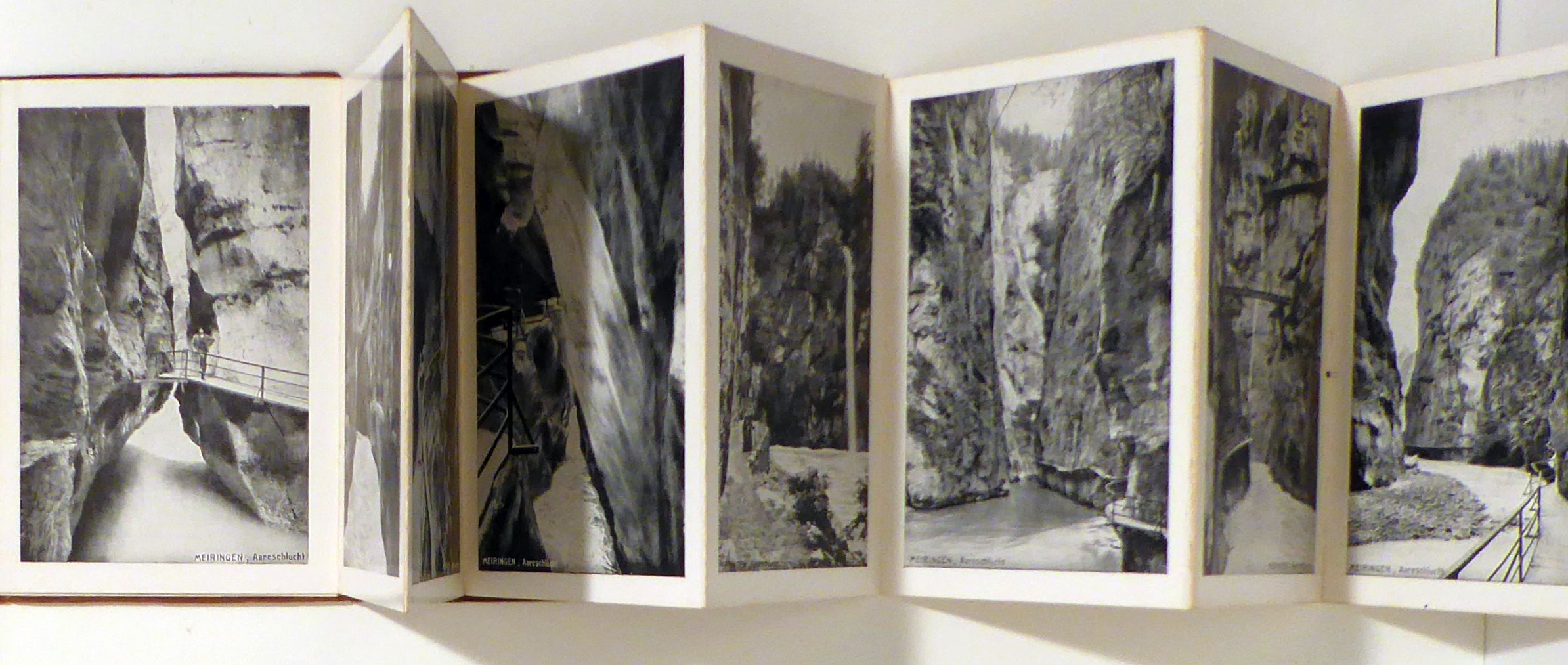 Gorges de l'Aar. Zürich: Photoglob, um 1900. 48 S., Einband: Klappenbroschur. Format: kl.8°. Klappenbroschur mit 12 Karten mit s/w-Abbildungen nach Fotografien mit Szenen aus der Aareschlucht. Hinten auf der Innenseite des Umschlags ein knapper Text mit Hinweisen über den Weg vom Bahnhof Meiringen zur Aareschlucht