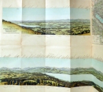 Karte und Panorama. Hrsg. vom Verkehrsverband für den Pfannenstiel. Zch.: Hofer, 1920. 1 mehrfach gefaltetes Blatt, farbig lithographierte Karte sowie rückseitig eine zweigeteilte chromolithographierte Aussicht, umgezeichnet nach dem Panorama von H[einrich] Keller und X[aver] Imfeld von insgesamt 118 cm Länge. Zudem eine gegraphische Karte des Zürichsees. Einband: illustr. Or.kt. Format: 90 x 48 cm. Erstausgabe. Hauri (Hofer & Burger) 268. Umschlag mit einer farbigen Lithographie von G[ottlieb] Merki, Männedorf, "Ausblick von der Okenshöhe". Auf der Rückseite Liste mit "Aussichtspunkte, Spazierwege u[nd] Ausflüge