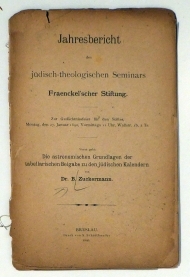Zur Gedächtnisfeier für den Stifter, Montag, den 27. Januar 1890. Breslau: Schottlaender, 1890. 23, XI S., Einband: ohne Einband. Format: gr.8°. Reihe: Jahresbericht des Jüdisch-Theologischen Seminars Fraenckel'scher Stiftung ; 1890.