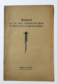 Ffm.: K. C.-Blätter, 1916. 16 S., Einband: Original-Broschur, klammergeheftet. Format: 8°. Antwort auf den offenen Brief Bubers "Begriffe und Wirklichkeit", in dem dieser Cohens Verhältnis zum Zionismus kritisiert hatte. Sonderdruck aus der 12. Kriegsausgabe der K.C.-Blätter (Monatsschrift der im Kartell-Convent vereinigten Korporationen der Verbindungen Deutscher Studenten Jüdischen Glaubens, gedruckt in Fraktur