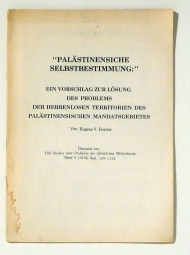 Ein Vorschlag zur Lösung des Problems der herrenlosen Territorien des palästinensischen Mandatsgebietes [Mit einem Vorwort des deutschen Bundestagsabgeordneten Erik Blumenfeld, CDU]. Bonn: Deutsch-Israelische Gesellschaft, 1980. 28, (2) S., Einband: Original-Broschur. Format: gr.8°. Übersetzt aus Yale Studies über Probleme der öffentlichen Weltordnung, Band 5 (1979), Seite 147-172