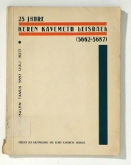 (5662-5687) Bericht des Hauptbüros des Keren Kayemeth Leisrael. Jerusalem: Tamus, 5687 Juli 1927. 200 S., mit zwei doppelt gefalteten Fotocollagen. Einband: Original-Broschur. Format: gr.8°. Umfangreicher Bericht über den KKL mit zahlreichen Statistiken, Tabellen und Bilanzen. Zu den Hauptthemen gehören die Auseinandersetzung um die Bodenpolitik sowie Siedlungsfragen. Mit einer s/w-Karte, in der "jüdischer Besitz" und "KKL-Besitz" eingetragen sind und mehrere Statistik-Tafeln die gestalterisch an Wiener Statistik erinnern. Die beiden dreiseitigen Foto-Collagen heissen "Die Erlösung des Bodens" und "Städtische Siedlung". Vorhanden ist auch das meistens fehlende Blatt mit den Druckfehlerberichtigungen. Äusserst selten