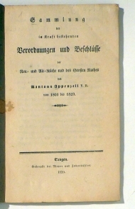Der Neu- und Alt-Räthe und des grossen Rathes des Kanton Appenzell V.R. von 1803 bis 1829. Trogen: Meyer und Zuberbühler, 1829. 58, (4) S., Einband: Or.br. Format: gr.8°. Barth 24834