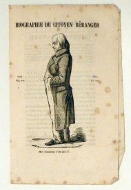 Paris: Vente, 1848. 7 S., mit einem Holzschnitt-Porträt von Béranger auf dem Umschlag. Format: 8°. Flugschrift mit einer mit "J. C." gekennzeichneten Biographie des französischen Chansonniers Pierre-Jean de Béranger. Am Schluss sein dem - bereits gestorbenen - Freund Jacques-Antoine Manuel gewidmeten Lied auf die Februar-Revolution (gegen Louis-Philippe) von 1848. Der Autor fordert auf, bei den nächsten Wahlen, neben Lamartine, Louis Blanc und Ledru-Rollin auch Béranger auf die Liste zu setzen und erinnert daran, was die französischen Bürger mit Manuel verloren hätten. Manuel ruht auf dem Père Lachaise, Béranger wurde später im gleichen Grabe beigesetzt. Sehr selten