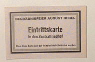 Eintrittkarte in den Zentralfriedhof - Ohne diese Karte darf der Friedhof nicht betreten werden. 1913. Format: 11,5 x 7,5 cm (bxh). Erstausgabe. Die Beerdigung von August Bebel am 17. August 1913 brachte Menschen aus ganz Europa nach Zürich. Mehr als 15000 Personen nahmen an der Trauerfeier teil. Der Zugang auf den Friedhof wurde deshalb reglementiert. Um Schaden an andern Gäbern zu vermeiden, wurden nur 1200 Personen eingelassen. Zu Chopins Trauermarsch zog die Menge von der Rämistraße durch Aussersihl zum Zentralfriedhof (heute Friedhof Sihlfeld). Bebel war häufig in der Schweiz zu Besuch seiner Tochter, die hier, verheiratet mit einem Arzt, lebte. Bebel war im Schweizer Bad "Passugg" zur Kur, als er starb und er hatte testamentarisch verfügt, dass er in Zürich beerdigt werde. Beigelegt die August Bebel-Nummer der "Zürcher Wochen-Chronik" vom 23. August 1913 (XV. Band, N°. 34, VIII, S. 401-410). Mit einer 10seitigen Reportage über die Beisetzung von August Bebel auf dem Zürcher Zentralfriedhof (später Sihlfeld) mit 18 s/w-Abbildungen nach Fotografien und einem Begleittext. Die "Zürcher Wochen-Chronik" war ein eher bürgerliches Blatt mit einem umfangreichen Anzeigenteil.