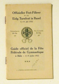 Basel: J. Frehner Buchdruckerei, 1912. 64 S, mit Abbildungen nach Fotografie und einem farbigen Faltplan. Einband: Original broschiert. Format: kl.8°. 56. Eidgenössisches Turnfest.