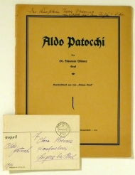Bern: Buchdruckerei Pochon-Jent, 1933. mit 11 ganzseitigen s/w Illustrationen nach Holzschnitten von Aldo Patocchi auf einseitig bedruckten Blättern. Einband: Original-Broschur. Format: 4°. Sonderabdruck aus dem "Kleinen Bund". Mit einer eigenhändigen Widmung des Verfassers für die Künstlerin Clara Woerner auf dem Deckel. Inliegend eine Weihnachtskarte von Aldo Patocchi an Clara Woerner, Handweberei, Ligerz bei Biel, gedruckt in Fraktur