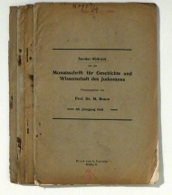 Sonder-Abdruck aus der Monatsschrift für Geschichte und Wissenschaft des Judentums. Herausgegeben von M[arcus] Brann. Breslau: Favorke, 1916/1917. 4 Faszikel, Einband: ohne Einband. Format: gr.8°. Reihe: Monatsschrift für Geschichte und Wissenschaft des Judentums. Jahrgang 60 (N. F. 24), S. 381-391, 453-467; Jahrgang 61 (N. F. 25), S. 51-71,166-175.