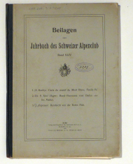 Komplette Original-Mappe mit den Artistischen Beilagen zum Jahrbuch des Schweizer Alpenclub, Band 44 (ohne das zugehörige Jahrbuch): Barbey, Albert, [1852-1926]. La chaîne du Mont Blanc. IV. Massif du Trient. 1: 50'000. Nouvelle édition de 1906 en 4 feuilles. Topographie par X. Imfeld. Hypsométrie et nomenclature par Louis Kurz. Berne: Institut géograph. et artist. de Kümmerly & Frey. [Bern: Verlag der Expedition des Jahrbuches des S. A. C. A. Stämpfli & Cie.]. Bern: Schweizer Alpen-Club, 1909. 1 Bl., 27 x 38 cm (bxh); gefaltet 18 x 24 cm. Hauri (SAC, Artistische Beilagen) K 50.4. Lithographie. Mappentitel: A. Barbey: Carte du massif du Mont Blanc. Feuille IV. Es handelt sich um die durch Kurven ergänzte und in der Hypsometrie u. Nomenklatur sorgfältig revidierte Mont Blanc-Karte von Imfeld, Barbey und Kurz von 1893, deren Ankauf durch den S. A. C. 1894 verweigert wurde. Hager, P. Karl [Christian], [1862-1918]. Rundsicht vom Badus oder Six Madun, 2931 m. ü. M. Naturaufnahme von Dr. P. Karl [Christian] Hager, Disentis (Sektion Piz Terri). Druck Bümpliz: Benteli A.-G. Bern: Schweizer Alpen-Club, 1909. 1 Bl., 94 x 17 cm (bxh); gefaltet 18 x 26 cm. Hauri (SAC, Artistische Beilagen) P 162. Photographie, wiedergegeben im Lichtdruck, schwarz. Mappentitel: Dr. P. Karl Hager: Rund-Panorama vom Badus oder Six Madun. Jörgensen, J. Rundsicht von der Roten Fluh im Rottal bei Lauterbrunnen. Aquarell von Kunstmaler H. J. Jörgensen. Druck: Bümpliz: Benteli A.-G. Bern: Schweizer Alpen-Club, 1909. 1 Bl., 85 x 17 cm (bxh); gefaltet 18 x 26 cm. Hauri (SAC, Artistische Beilagen) P 163. Koloriert. Vierfarbendruck, gerastert
