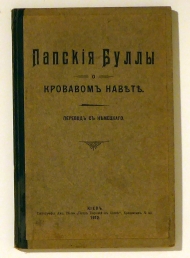 Kiev: Ges. Petr Barskij, 1912. 105 S., Einband: Halbleinwand der Zeit. Format: 8°. Übersetzung von: Die päpstlichen Bullen über die Blutbeschuldigung. Berlin 1893