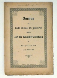 Königshütte: Druck Giebler, 1907. 10 S., Einband: ungebunden. Format: gr.8°. Titel auf dem Umschlag: Vortrag von Fürstl. Archivar Dr. Zivier-Pless auf der Hauptversammlung in Königshütte O.-S. am 27. Oktober 1907, gedruckt in Fraktur