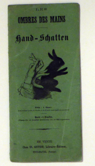 Neuchâtel [Suisse]: chez Ul. Guyot, Libraire - Éditeur, [1880]. 1 Bl. 35x22,5 cm (bxh), gefaltet 10,5x22,5 cm, mehrfach gefaltetes Blatt mitr 12 s/w-Abbildungen. Einband: Or.br. mit Klappendeckel. Format: gr.8°, mehrfach gefaltet. Pour reproduire les figures ci-contre, il ne faut ni grands frais d'établissement ni appareil spécial. Placez-vous seulement entre la lampe et la muraille [...] Um die beiliegenden Figuren darzustellen, braucht es keine großen Kosten und keine speziellen Apparate. Es ist bloß nöthig, sich zwischen ein Licht und eine Mauer zu stellen [...]. Auf einem mehrfach gefalteteten Blatt sind 12 Schattenfiguren abgebildet und wird gezeigt, wie dafür Hände und Finger gehalten werden müssen. Selten