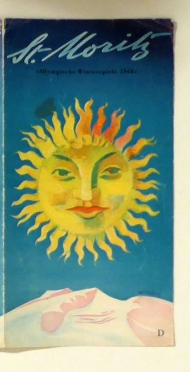 Olympische Winterspiele 1948. Zürich: Conzett & Huber, 1948. 1 Blt., mit mehrfarbiger Grafik und s/w-Abbildungen nach Fotografien. Einband: Einblatt. Format: 43x21 cm (bxh); gefaltet 11x21 cm. Erstausgabe. Deutsche Version (Vermerk "D" auf der Titelseite) des Prospekts für die ersten Olympischen Winterspiele nach dem Zweiten Weltkrieg. Mit einer Panoramakarte von St. Moritz, eingezeichnet die diversen Orte der Wettbewerbe. Mit der berühmten "St. Moritz-Sonne von Weiskönig sowie Abbildungen nach Fotografien von Werner Bischof, E. A. Heiniger, Heinz Niedecken und den frères Seeberger. Selten