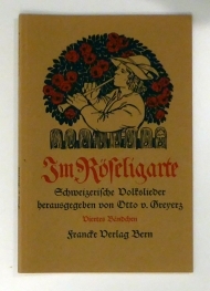 Schweizerische Volkslieder hrsg. von Otto von Greyerz. Mit Buchschmuck von Rudolf Münger. Viertes Bändchen. Bern: A. Francke, 1976. 77, (1) S., farbige Deckelillustration und Buchschmuck von Rudolf Münger. Einband: Illustr. Or.kt. Format: 8°. Reihe: Im Röseligarte, viertes Heft [von insgesamt 6].