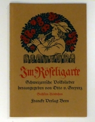 Schweizerische Volkslieder hrsg. von Otto von Greyerz. Mit Buchschmuck von Rudolf Münger. Fünftes Bändchen. Bern: A. Francke, 1976. 83 S., farbige Deckelillustration und Buchschmuck von Rudolf Münger. Einband: Illustr. Or.kt. Format: 8°. Reihe: Im Röseligarte, fünftes Heft [von insgesamt 6].