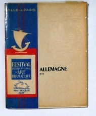 Le rendez-vous des théâtres du monde Mai-Juillet 1955: Allemagne (Est). [Paris]: Fischer, 1955. 20 Bl., Mit zahlreichen s/w Abbildungen. Einband: Original-Broschur mit Pergaminfolie. Format: 4°. Begleitbroschüre zum 2. internationalen Theaterfestival Paris. Beiliegend Programmheft zur Aufführung von Brechts "Der Kaukasische Kreidekreis" im Théâtre Sarah Bernhardt, eine Eintrittskarte zur Aufführung am 20. Juni, ein Zeitungsausschnitt mit Fotografie von Bertolt Brecht, die ihn bei der Rückkehr aus Moskau nach der Verleihung des Stalin-Preises zeigt. Ausserdem ein Program des Festival international d'art dramatique, ein Programm "Spectacles de Paris" vom 22.-28. Juni 1955 sowie eine Theaterkritik