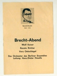 Das Orchester des Berliner Ensembles. Leitung: Hans Dieter Hosalla. (Bln.): (6) S., Vorderumschlag mit Porträt-Vignette von Bert Brecht nach einer Zeichnung, 1 s/w Abbildung nach einer Fotografie mit Renate Richter, Wolf Kaiser und Vera Oelschlegel. Einband: Or.br.mit Klammerheftung. Format: 4°. Programmheft mit den Texten 'Die Ballade vom angenehmen Leben', 'Die Moritat von Mackie Messer', 'Vom armen B.B.', Erinnerung an die Marie A.', '1941', 'Die Seeräuber Jenny', Ballade von der Judenhure Marie Sanders' und 'An die Nachgeborenen'. Mit dem Orchester des Berliner Ensembles unter Leitung von Hans-Dieter Hosalla. Wann und wo der Liederabend stattfand, liess sich nicht ermitteln