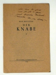 Zch.: Les Cahiers Luxembourgois, 1958. [8] S., mit drei blattgrossen Illustrationen nach Zeichnungen vonFrantzz Kinnen. Einband: O.br. Format: 8°. Erstausgabe. Separatausgabe aus den "Les Cahiers Luxembourgois". Weihnachtserzählung, illustriert durch den luxemburgischen Künstler Frantz Kinnen (1905-1979). Mit einer mehrzeiligen Widmung an den schweizerischen Autor René Gardi. Gedruckt auf hellbraunem gefaserten Papier. Sehr selten, nachgewiesen ist ein einziges weiteres Exemplar