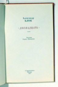 Poema. Risunki Borisa Diodorova. Moskva: Sovremennik, 1977. 77 S., mit zahlreichen ganzseitigen s/w Illustrationen. Einband: Original-Leinwand. Format: 4°. В канун 60-летия Октябрьской революции в 1977 году для юбилейного издания поэмы Александра Блока «Двенадцать» в издательстве «Современник» Борисом Диодоровым были выполнены иллюстрации в технике офорта с акватинтой. Издание имело большой успех у книголюбов, несмотря на то, что в нем иллюстрации Диодорова оказались «обрезаны». Кроме того, в книгу не вошла важная композиция «Вся власть Учредительному собранию!» (https://nsb-bibliophile.ru/knizhny-mir.html/news_post/v-izdatelstve-stolyarovyh-vyshla-poema-dvenadcat-aleksandra-bloka-s-illyustraciyami-b-a-diodorova) [Jubiläumsausgabe des Poems von Blok zum 60. Jahrestag der Oktoberrevolution. Reich illustriert mit Radierungen von Boris Diodorov
