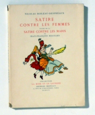 Suivie de la Satire contre les Maris de Jean-François Regnard. Publiées d'après les éditions originales de 1694. Avec notice bibliographique par Louis Perceau et illustrées par Joseph Hémard. Paris: Briffaut, 1927. 82, [3] S., mit farbigen Illustrationen. Einband: Original broschiert mit illustriertem Schutzumschlag. Format: 8°. Nummeriertes Exemplar, Nr. 536 von 1000 Exemplaren auf Vélin