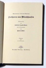 Feldzüge und lustige Abenteuer des Freiherrn von Münchhausen wie er dieselben bei der Flasche im Zirkel seiner Freunde selbst zu erzählen pflegt. Memmingen: Maximilian Dietrich, 1968. 135 S., mit 26 s/w Illustrationen nach Holzschnitten von Otto Schubert. Einband: Original-Pappband. Format: gr.8°.