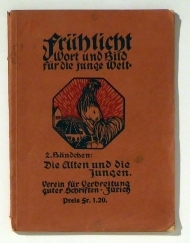 4. Bändchen: Heimat und Fremde. Hrsg. von Heinrich Moser. 17. - 21. Tsd.. Zch.: Verein für Verbreitung guter Schriften, [um 1920]. 64 S., mit zahlreichen farbigen und teilweise ganzseitigen Illustrationen in Jugendstil nach Zeichnungen von Theodor Barth, Eduard Stiefel und Gertrud Pfeiffer-Kohrt. Einband: Or.kt. Format: 8°. Reihe: Frühlicht. Wort und Bild für die junge Welt, 4.