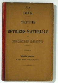 Zusammengestellt vom Technischen Inspektorat im schweiz. Eisenbahn- und Handels-Departement. Bern: Rieder & Simmen, 1874; 1875. 28 mehrfach gefaltete Blätter, Einband: Or.Hln. Format: 2°. Bestandesaufnahme sämtlichen rollenden Materials der schweizerischen Eisenbahn per 1874, resp. 1875, gegliedert nach Bahngesellschaft und tabellarisch geordnet. Erfasst sind für Zugmaschinen 52 Kriterien und für Wagen deren 44. Die beiden Inventare sind in einem Band zusammengebunden. Das Titelblatt für die Hauptstatistik heisst "1874 Statistik des Betriebs-Materials der Schweizerischen Eisenbahnen", bei der Ergänzung "Nachtrag pro 1875. Statistik des Betriebs-Materials der Schweizerischen Eisenbahnen". Auf dem Deckel ist der gedruckte Titel "1875 Statistik des Betriebs-Materials der Schweizerischen Eisenbahnen" darüber handschriftlich mit "1874 und" ergänzt. Für die schweizerische Eisenbahngeschichte ausserordentlich wichtiges statistisches Quellenwerk