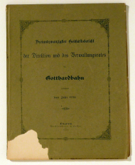 [Luzern]: Gotthardbahngesellschaft, 1876. 50 S., Einband: Original broschiert. Format: 8°. Enthält den Bericht des Verwaltungsrathes der Gotthardbahn, gezeichnet von Feer-Herzog und Schweizer, das Schreiben an den Bundesrat, gezeichnet von A. Escher und Schweizer sowie die Antwort des Bundesrates , gezeichnet von Welti und Schiess. - Rücken mit Original Lackpapierstreifen verstärkt