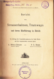 Im Auftrage der Gemeindekommission der Stadt Zürich und der Ausgemeinden erstattet durch A[rnold] Bürkli-Ziegler und P[eter] E[mil] Huber. Zch.: Orell Füssli, 1878. VIII, 150 S., Mit Abbildungen im Text sowie zwei Tafeln. Einband: Pr. Lwd. Format: 8°. Reihe: Technische Mittheilungen, 11. Heft.